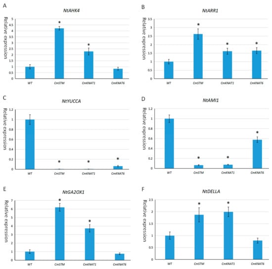 Detection of expression of hormone pathway-related genes in tobacco plants overexpressing chrysanthemum KNOX gene (Asterisks indicate a significant difference in gene expression compared to wild-type plants (WT)); (A,B) show the relative expression of genes related to cytokinin pathway; (C,D) show the relative expression of genes related to auxin pathway, and (E,F) show the relative expression of genes related to gibberellin pathway.
