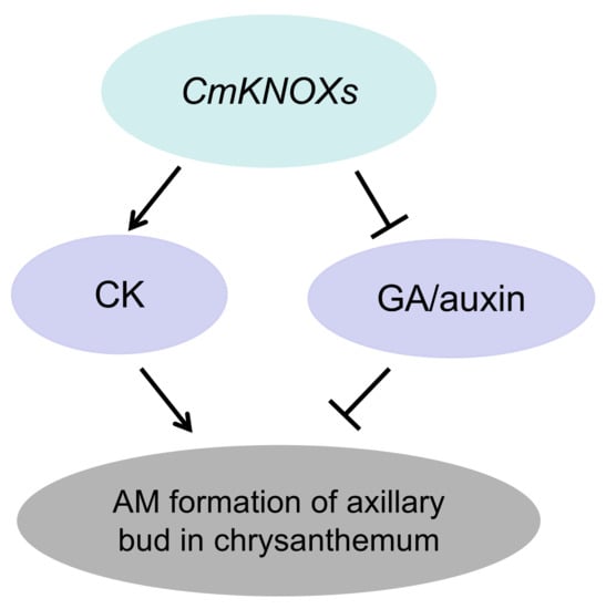 KNOX genes often exert their regulatory function by influencing the hormone pathway. For example, KNOX genes can inhibit the function of GA by down-regulating the expression of genes related to GA synthesis and up-regulating the expression of genes related to GA degradation [,,]. In addition, KNOX genes can also maintain the normal development of SAM by activating the gene expression encoding CK biological synthetase [,]. The ectopic expression of KNOX genes in leaves can affect the auxin signal, thus changing the normal morphology of leaves []. In this study, we detected the expression of hormone pathway-related genes in the axillary bud of tobacco overexpressing the chrysanthemum KNOX gene and found that GA and auxin signals were down-regulated, while CK signals were up-regulated. Therefore, these three chrysanthemum KNOX genes may promote the formation of AM in the axillary bud by promoting the CK signal and inhibiting GA and auxin signal at the same time (Figure 12).