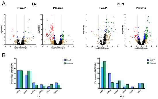 Differentially expressed RNAs in SLE patients with or without renal damage in each biological fraction compared to control subjects. (A) Volcano plot depicts significantly altered RNAs found in LN or nLN. Each dot represents an RNA; non-significant false discovery rate (FDR > 0.05) and log2 fold-change ≥−1.5 or ≤1.5) in black, log2 fold-change ≤−1.5 or ≥1.5 in brown, significant FDR in blue and significant FDR and log2 fold-change ≥1.5, green (up-regulated) or ≤−1.5 in red (downregulated). The threshold dotted line for −log10(FDR) it was <0.05 and for log2 fold-change was ≤1.5 or ≥−1.5, and; (B) Bar graph of RNA subtype percentages according to the two biofluids in LN and nLN. DE: differentially expressed; Exo-P: plasma exosomes; LN: lupus nephritis; nLN: non lupus nephritis. lncRNA: long non-coding RNA; miRNA: microRNA; mRNA: messenger RNA; piRNA: PIWI-interacting RNA.
