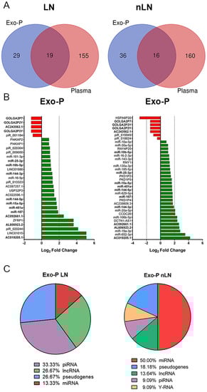 Differentially expressed ncRNAs profiles in plasma exosome fraction of SLE patients with or without LN compared to control subjects. (A) Venn diagram shows the overlap among biological fractions. (B) Diverging bar charts show the fold-change expression of the exosomal non-coding RNAs signature in both groups: upregulated are in green and downregulated in red. Common NcRNAs in both signatures are in bold. logFC: logarithm 2 base fold-change; (C) Proportions of DE ncRNA biotypes in plasma exosomes from SLE patients with LN or without (nLN). Exo-P: plasma exosomes; LN, lupus nephritis; lncRNA: long non-coding RNA; miRNA: microRNA; piRNA: PIWI-interacting RNA; nLN: non lupus nephritis.