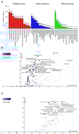 Functional enrichment analysis of the DE exosomal miRNA targets in SLE patients with LN. (A) GO analysis of the DE targeted genes. The vertical axis indicates the number of targeted genes in a particular hierarchical cluster in biological process, cellular component and molecular function. (B) Volcano plot of GO terms enrichment analysis, according to the enrichment ratio (horizontal axis) and –log10(FDR) (vertical axis). The top 20 significant GO terms are described. (C) Volcano plot of the KEGG pathway enrichment analysis. The top 20 significant KEGG pathways are described. The size and color of the dot (enriched gene set) is proportional to the size of the category.