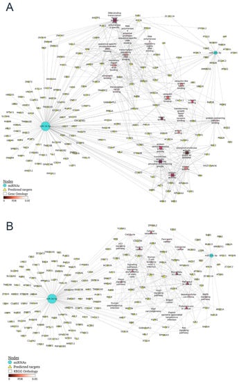 Regulatory networks of miRNAs–mRNAs for exosomal fraction in LN. (A) The two miRNAs (miR-16-5p and miR-101-3p) blue circles and their predicted targeted genes (yellow triangles) are shown together with the top 20 GO terms whose color is proportional to the FDR value, and (B) the top 20 KEGG pathways.