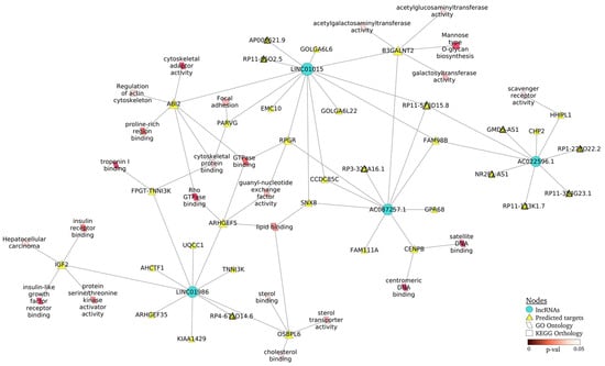 Next, we examined the details of the lncRNA–mRNA interaction network in LN (Figure 5), including the top GO terms (parallelogram form) and KEGG pathways (triangle form). We observed that LINC01015 and LINC01986 regulated most of the targets included in the biological pathways, highlighting Rho GTPase binding and GTPase binding (ABI2, ARHGEF5 and RPGR), cytoskeletal function (ABI2, FPGT-TNNI3K and PARVG) and insulin-like growth factor receptor binding (IGF2) as GO terms, as well as focal adhesion (PARVG) and regulation of actin cytoskeleton (ABI2) as KEGG pathways. In addition, we could observe that lncRNA not only regulated coding targeted genes, but also others lncRNAs (triangles with bold border, Figure 5).