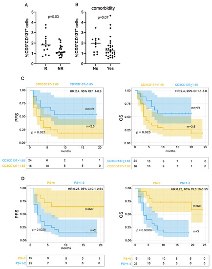 CD137+ T cells are correlated with response to anti–PD–1 treatment and patient survival. (A) The scattered dot plot shows the values of CD3+CD137+ cells in responder (R) and non–responder (NR) patients ± standard deviation (SD). The horizontal lines correspond to the median values of CD3+CD137+ lymphocytes of the two groups. (B) The scattered dot plot represents the values of CD3+CD137+ cells in patients with (Yes) or without (No) comorbidities. The horizontal lines correspond to the median values of CD3+CD137+ lymphocytes of the two groups. (C) Kaplan–Meier curves for PFS and OS were used to determine 1.65% as the cut-off of circulating CD3+CD137+ cells wherein patients with a percentage ≥1.65% showed prolonged survival. (D) Kaplan–Meier curves for PFS and OS considering the score related to performance status (PS) (PS = 0 vs. PS1 = 1, 2). Patients with PS = 0 showed a longer PFS and OS than those with PS = 1, 2. m = Months; NR = not yet reached.