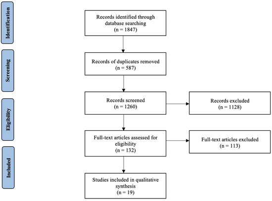 The literature search yielded a total of 1847 studies. Following the removal of 587 duplicate studies, 1260 independent studies had their titles screened for relevance for inclusion in this study. Of these, 380 had their abstracts reviewed for relevance and 132 required full-text manuscript review. Overall, nineteen studies were included in this systematic review, of which one was a prospective, multicentre clinical trial [14]. All of the other 18 included studies were of retrospective design [22,23,24,25,26,27,28,29,30,31,32,33,34,35,36,37,38,39]. A PRISMA flow diagram detailing the systematic search process is outlined in Figure 1.