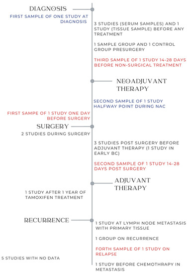 Of the nineteen included studies, eleven studies obtained patient tissue at one timepoint during their study [22,23,24,25,26,30,31,33,34,36,39], while five studies did not report the timing of when their samples were taken [27,28,29,37,38]. Three studies measured miRNA expression at varying timepoints (i.e., at diagnosis, pre-surgery, post-surgery, pre-adjuvant therapy, and post-adjuvant therapy) [14,32,35] (Figure 2).