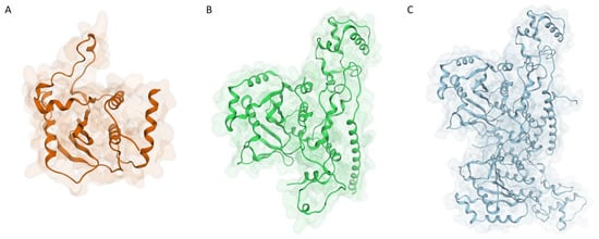 Structure of the three models generated for the monkeypox I7L protease: (A) monomeric model generated with Phyre2 using S. cerevisiae Ulp-1 protease (PDB ID: 1EUV) as a template; (B) monomeric model generated with AlphaFold2; (C) dimeric model generated with AlphaFold2.
