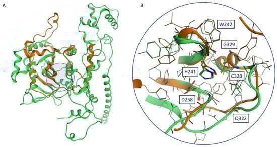(A) Superposition between the Phyre2 monomeric model (orange) and the AlphaFold2 model (green): the location of the catalytic site is highlighted by a blue circle. (B) Superposition between the catalytic sites of the Phyre2 monomeric model (orange) and the AlphaFold2 model (green): conserved residues reported in the work of Byrd et al. [] are labeled.