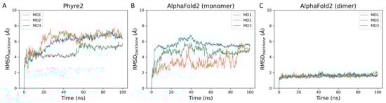 To assess the validity of generated models, we performed molecular dynamics simulations to evaluate the models’ stability. Three independent MD replicates, with each 100 ns in duration, were carried out on each of the models. The time-dependent evolution of the backbone RMSD for each of the models is reported in Figure 3.