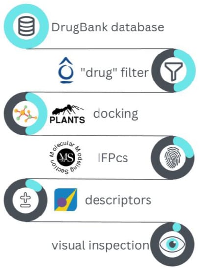 The validated I7L protease structure model was used to perform a docking-based virtual screening of the DrugBank database toward the potential repurposing of existing drugs as antiviral agents against the monkeypox virus. Specifically, DrugBank is a library that collects about 11,614 molecules, including FDA-approved drugs (both small molecules and biotech), nutraceuticals, and experimental therapeutics (molecules that reached various stages of clinical experimentation). The workflow for the executed virtual screening is schematized in Figure 4 and explained in detail hereafter.