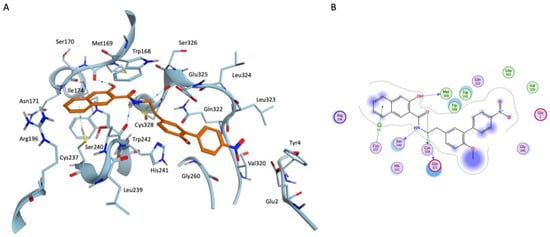 At first, docking poses for the query compounds were compared to the selected TTP-6171 pose reported in Figure 5, chosen among the top-scoring poses through visual inspection. In this docking pose the compound nicely complements the shape of the binding site and its key interaction features. Particularly, in this pose the naphthol moiety of TTP-6171 stacks between the sidechains of W168 and W242, establishing both hydrophobic and π-stacking interactions. Furthermore, the central node of the ligand (that mimics a glycine residue, which is commonly found at the cleavage site), is placed in the narrowest portion of the channel, close to the catalytic C328. Finally, further stabilizing interactions include the H-bond between the backbone of M169 and the hydroxyl group of the naphthol and another H-bond between the amide hydrogen of the “pseudo-glycine” portion of the ligand and the backbone of S240.