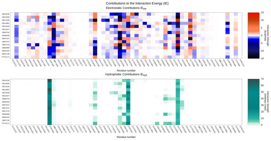 The conservation of crucial binding interactions between the reference TTP-6171 and query compounds found through the docking-based virtual screening is highlighted by the aggregate heatmap, reported in Figure 6, which reports a per-residue interaction energy decomposition for both the electrostatic and hydrophobic components to the protein–ligand interaction.