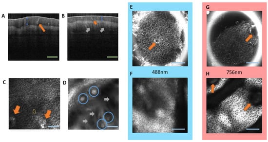 In the present study, two techniques were used with different spatial resolutions and possible applications (Figure 1). OCT provides the SC thickness (Figure 1A,B, blue arrow), the sweat gland morphology (Figure 1A,B, orange arrow), and allows for the visualization of the papillae, depending on the SC thickness (Figure 1B, gray arrows). The resolution of OCT is limited (axial resolution between 5 and 15 µm), and details such as the position and shape of MCs are missed. A very useful feature of this method is the imaging of longitudinal cross-sections and the fast quantification of SC thickness.