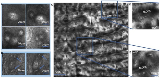 We observed the MCs in the dermal–epidermal junction (DEJ) of glabrous skin by LSM, presenting an ellipsoidal or spherical shape (Figure 2A). The appearance of MCs and their distinction from sweat glands is further demonstrated in Supplementary Figure S1 in the Supplementary Material. They occur as singles, pairs, or triplets in the same papilla. The MCs have an interesting proximity to blood capillaries in the dermis (Figure 2B, blue arrow). The Supplementary Material provides additional images of MC morphologies and blood capillaries in the dermis (Supplementary Figure S2). For a better representation of the blood capillaries in the dermal–epidermal junction, VivaStack images should be recorded with a 1.5 µm height increment. Overview imaging confirms that the MCs are most often situated next to the ridges (Figure 2C–E).