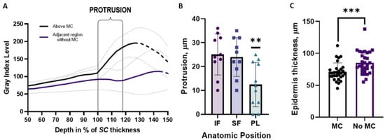 (A) Gray level index as a function of the depth as the percent of the stratum corneum thickness. Average data for the small finger of all participants are compared for regions with MCs and adjacent region without MCs. The onset of reflectance at a lower depth above the MC indicates a protrusion of the epidermis into the stratum corneum. The decay of GIL at a greater depth is due to the limited penetration depth of the light. The respective data points are represented by the dashed line. (B) Distribution of the protrusion height for index finger (IF), small finger (SF), and tenar palmar region (PL). Protrusions are higher in the finger skin compared to the palm (** p = 0.003). (C) The epidermis without MCs is thinner for the regions with MCs (*** p < 0.001).