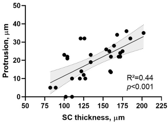 The height of the protrusions is positively correlated (R2 = 0.49; p < 0.001) with the SC thickness (Figure 5).