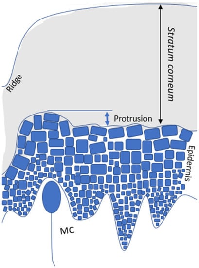 Non-invasive optical techniques allow for a more suitable implementation of human skin physiology studies, by avoiding biopsies []. Only few studies have looked at the skin physiology of glabrous skin using non-invasive techniques, despite the necessity to understand the role of healthy skin physiology in tactile perception and how some diseases may affect the skin innervation [,]. Established in vivo microscopy techniques, such as optical coherence tomography (OCT) and laser scan microscopy (LSM) share the problem of the thick SC of glabrous skin limiting the optical access to the viable epidermis and the dermis, reducing the spatial resolution and affecting the quantification of MCs. An improved understanding of the skin morphology associated with MCs and its imaging by these noninvasive techniques is essential to introduce them as alternatives to biopsies in the quantification of MCs in glabrous skin.