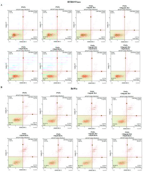 The representative results of the apoptosis profile obtained by flow cytometry with the Apoptosis Assay for Muse Cell Analyzer of differently stimulated HTR-8/SVneo (A) and BeWo (B) cells.