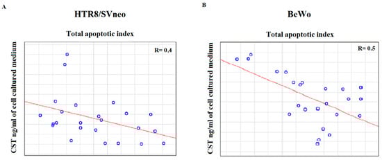Spearman’s rank-order correlation between CST level and total apoptotic index (index for early and late apoptosis): (A) HTR-8/SVneo; (B) BeWo cell line.
