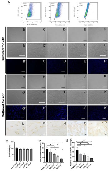 We applied trypan blue staining to count the number of viable cells. The immunocytochemistry method of proliferating cell nuclear antigen (PCNA) was used to detect the cells in different groups in a proliferating state. Specifically, cells were fixed with 4% paraformaldehyde, permeabilized with 3% Triton X-100 (Sigma, St. Louis, MO, USA), and blocked with normal sheep blocking serum (ZSGB-BIO, Beijing, China) at room temperature for 30 min. Then, the cells were incubated with PCNA antibody (Abcam, Waltham, MA, USA, USA), diluted to a 1:50 ratio, at 4 °C overnight, and incubated with a secondary antibody conjugated to horseradish peroxidase (ZSGB-BIO) for 1 h. The cells were observed under a microscope after DAB staining (ZSGB-BIO). The PCNA-positive cell rate was determined as follows: PCNA-positive cell rate = number of positive cells with deep nuclear staining/total number of cells.