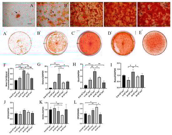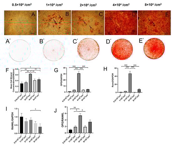 Effect of initial cell density on osteogenesis induction of hPDLSCs over 14 days. Calcium nodules produced through hPDLSC osteogenesis induction were observed under light microscope at different initial culture densities. The black arrows represent calcium nodules. (A–E) Overview of hPDLSC osteogenesis induction at different initial culture densities. (A’–E’) Single-cell mean calcium concentration produced by hPDLSC osteogenesis induction in the 2 × 104/cm2 cell density group was the highest. (F, p < 0.05). The expressions of OPG and RUNX2 and the OPG/RANKL ratio were the highest in the 2 × 104/cm2 group (F–J). (p < 0.05). * indicates p < 0.05, ** indicates p < 0.01; *** indicates p < 0.001. Scale bar = 50 μm.