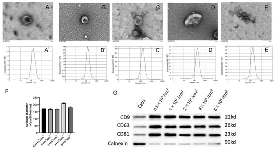 The characteristics of the exosomes were identified, including their morphology, diameter, and typical surface protein expression. The particle size and morphology of the exosomes were observed under transmission electron microscopy (TEM) (Figure 3A–E). The analysis results show that the average particle sizes of the 0.5 × 104, 1 × 104, 2 × 104, 4 × 104, and 8 × 104/cm2 initial cell density groups were in the range of exocrine particle sizes (20–500 nm) with a uniform diameter distribution (Figure 3A’–E’,F). The typical cup shape of the exosomes was observed in every group. The Western blotting results showed that, compared with the parent cells, all the exosomes were rich in typical exosomal surface proteins (CD9, CD63, and CD81) but deficient in calnexin (Figure 3G). In general, these results indicate that the exosomes were successfully produced by hPDLSCs.