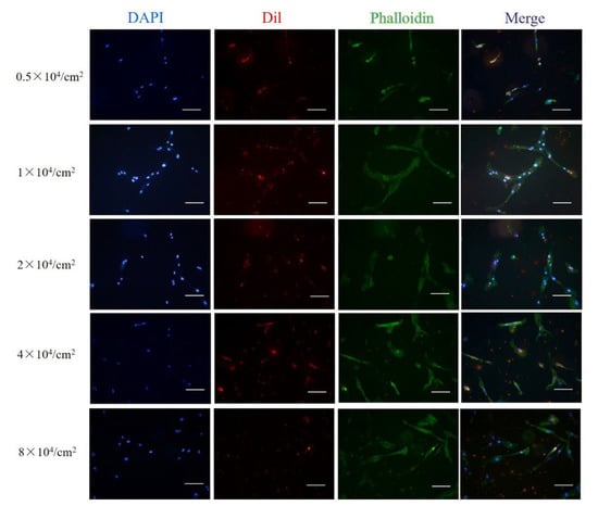 To study the effects of different hPDLSC exosomes derived from cultures with different initial cell densities (0.5 × 104, 1 × 104, 2 × 104, 4 × 104, and 8 × 104/cm2) on bone regeneration, we used a BCA protein assay kit (Thermo Scientific) to determine the concentration of exosomes according to the manufacturer’s instructions, and we used exosomes at 50 μg/mL to induce the osteogenic differentiation of hBMSCs in each group. First, the exosomes were labeled with Dil red fluorescent dye to ensure the visible internalization of the exosomes in the receptor cells. The fluorescence microscopy results showed that the exosomes in each group entered the cytoplasm of hBMSCs, and the receptor cells had high uptake efficiencies (Figure 4).