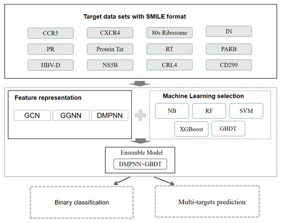 The workflow is shown in Figure 1. In this study, we first evaluated the performance of conventional machine learning methods including support vector machine (SVM) [22], random forest (RF) [23], naive Bayes (NB) [24], extreme gradient boosting algorithm (XGBoost) [32,33], and gradient boosting decision tree (GBDT) [31], based on the Morgan fingerprint [34]. Second, we developed three graph neural network-based molecular feature extraction models by integrating the optimal machine learning classifier GBDT, and binary classification models were constructed. Third, five-fold cross-validation was used to select the most suitable GNN model, which is DMPNN in this study. Finally, DMPNN + GBDT ensemble feature extraction and a target prediction model were used to predict drug multitargets of HIV-1 and HBV-related targets. The detailed results are shown below: