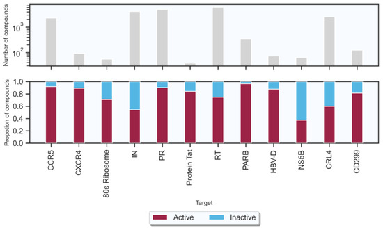 In this study, a total of seven targets related to HIV-1 and five targets related to HBV were obtained from the ChEMBL database [35] (version 32, https://www.ebi.ac.uk/chembl/ (accessed on 1 May 2022)) (shown in Table 1). The number of active compounds for each target is shown in Figure 2 (the criteria of “active” and “inactive” associations are shown in Section 4). The number of active compounds acted on HIV-1 and HBV targets were 13,627 and 2093, respectively, the number of inactive compounds related to HIV-1 and HBV targets were 4142 and 1120, respectively. Each of these 12 data sets was randomly divided into the training, validation, and test data sets by proportions of 0.8, 0.1, and 0.1, respectively. Table 1 shows the number of compounds in the training and test sets from the 12 data sets.