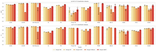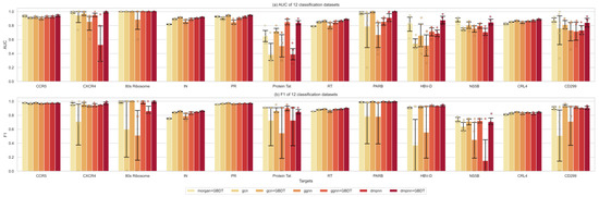 The performance of different kinds of classifiers in the 12 single-target predictions is detailed in Figure 5. Overall, the ensemble models performed better in the single-target prediction task than the simplex graph neural models or machine learning methods. Furthermore, the DMPNN-based ensemble model outperformed the other two GNNs on 10 out of the 12 data sets (83.3%) in the AUC values, and also 10 out of the 12 (83.3%) in the F1 metric, suggesting that it has more significant extracting ability for the current sets of HIV-1 and HBV target studies. Thus, ensemble graph-based models using integrated features can effectively improve the extraction efficiency of molecular features. Meanwhile, it is essential to evaluate the performance of different graph neural network-based feature extraction algorithms on a specific prediction problem before further analysis.