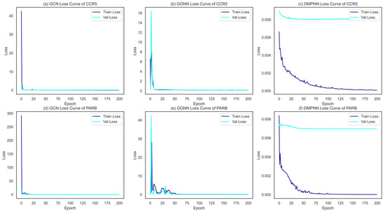 The loss curves of the three GNNs on one HIV-1 target (a–c), and one HBV target (d–f).