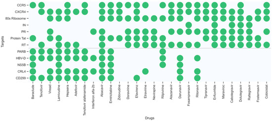 To explore the potential multiple targets of the known HIV-1/HBV drugs, a DMPNN + GBDT prediction model based on the 12 key targets related to HIV-1 and HBV was used to predict potential multiple bioactivities among them for the approved 22 HIV-1 drugs (abacavir, emtricitabine, lamivudine, viread (TDF), zidovudine, doravirine, efavirenz, etravirine, nevirapine, rilpivirine, atazanavir, darunavir, fosamprenavir, ritonavir, tipranavir, enfuvirtide, maraviroc, catotegravir, dolutegravir, raltegravir, fostemasavir, cobicistat) and 8 HBV drugs (baraclude, tenofovir, viread, lamivudine, hepsera, adefovir, tenofovir alafenomide (TAF), peginterferon alfa-2b). Figure 7 shows the multitarget distribution of these drugs, identified by our ensemble model. To verify the prediction results, the predicted targets were analysed using the PubChem BioAssay database [36], eight approved drugs and the corresponding experimental records are shown in Table 2.