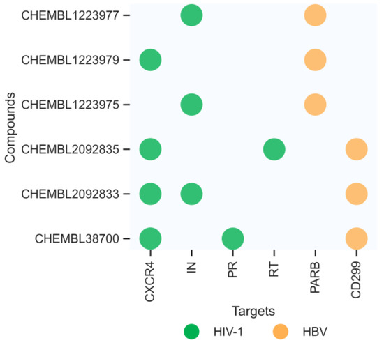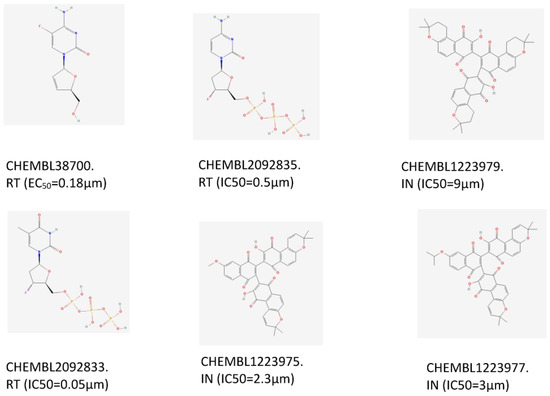 One of the most important applications of establishing a new prediction model is drug discovery. In our research, we aimed to find twin target directional drugs for HIV-1/HBV coinfection. Therefore, after the above verification of a potential new pharmacy of known approved clinical medicine, a set of ten compounds with known activity targeting at least one of the seven targets (PARB, CD299, CXCR4, IN, PR, RT) that was not involved in the training of the DMPNN + GBDT model was retrieved from the PubChem database. Among these prediction results, six compounds (the 2D structures and bioactivity data from ChEMBL data set are shown in Figure 8) were predicted to be simultaneously active against multiple HIV-1 and HBV targets, as shown in Figure 9. Moreover, some new predictions have been verified from previous research, such as CHEMBL38700 (name: Elvucitabine), which has been tested for the ability to inhibit HBV DNA synthesis using human hepatablastoma cell line HepG2 2.2.15 [52]; we also found the evidence of the inhibitory activity against growth of HIV-infected DLD-1 cell line and Hela CD4 cells with activity < 1 µm [53,54]. Moreover, in order to verify more detailed binding modes of these six compounds’ targets on the predicted targets, the molecular docking analysis provided more detailed inspection and evidence of the multibinding relationships of compounds and HIV-1/HBV targets (Figure 10), where all of these compounds occupied one stabilized hydrophobic pocket or hydrogen bonds formed by the targeting proteins, with detailed results shown in Figure 11.