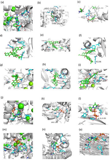 The detailed binding modes corresponding to Figure 10. (a): CHEMBL38700-CD299. (b): CHEMBL38700-PR. (c): CHEMBL1223975-PARB. (d): CHEMBL1223977-IN. (e): CHEMBL1223977-PARB. (f): CHEMBL1223979-CXCR4. (g): CHEMBL1223979-PARB. (h): CHEMBL1223985-IN. (i): CHEMBL2092833-CD299. (j): CHEMBL2092833-CXCR4. (k): CHEMBL2092833-IN. (l): CHEMBL2092835-CD299. (m): CHEMBL2092835-CXCR4. (n): CHEMBL2092835-RT. (o): CHEMBLE38700-CXCR4.