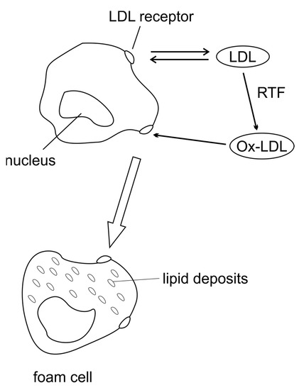 Nitrogen compounds also have a negative effect on the cell. In the synthesis of this compound oxide, the cofactor tetrahydrobiopterin (BH4) is essential. In oxidative stress, there is an increase in the amount of RFTs produced, which, by oxidizing the BH4 cofactor, causes NO degradation. The presence of its oxidised form reduces the bioavailability of nitric oxide, playing an important role in the pathogenesis of atherosclerosis. Numerous studies suggest that cellular deprivation of NOX 1 and 2 results in the production of reactive oxygen species. NADPH oxidase isoforms affect vasodilatory function in the vasculature and alter nitric oxide availability. Increased NOX expression results in an increase in p22phox accompanied by an increase in reactive oxygen species production, which modulates atherosclerotic plaque stability and the presence of oxLDL [5]. Induction of oxLDL by ROS allows passage through the damaged endothelium into the vasculature and enables the differentiation of monocytes into macrophages. These, in turn, by means of scavenger receptors absorbing oxLDL in an uncontrolled manner, become foam cells capable of accumulating into atherosclerotic plaques [10,29] (Figure 2). In the presence of T lymphocytes, oxLDLs activate the immune response. In addition to exhibiting proatherogenic properties, they stimulate leukocyte adhesion, promote vasoconstriction, enhance platelet aggregation and increase the expression of growth factors, thus contributing to vessel wall remodeling [10]. Mitochondrial lipids become the main target of RFT damage. Cardiolipin, due to the presence of a large amount of unsaturated fatty acids, becomes very vulnerable to external agents. The high content of its oxidised form is a pro-inflammatory signal, activating the expression of leukotrienes and adhesion molecules (ICAM-1 and VCAM-1) [17].