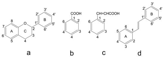 Basic structure of (a) flavan, (b) benzoic acid, (c) cinnamic acid, and (d) stilbene.