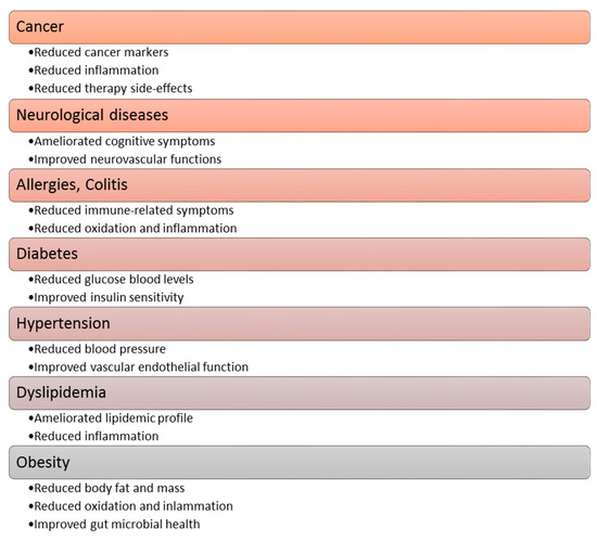 Polyphenol compounds exhibit a number of beneficial properties for health, repeatedly constituting a specific therapeutic potential [29,45,50]. Heretofore, among others, the anticancer, antidiabetic, neuro-protective, and cardio-protective effects of polyphenolic [36,41], and a positive impact on the course of osteoporosis, allergies and obesityhaves been proven [34]. The functional effects of polyphenolic compounds in relation to the aforementioned diseases are shown in Figure 4 [34]. A more detailed description of the effects of polyphenols on the cardiovascular system is described in Section 7 of this article.