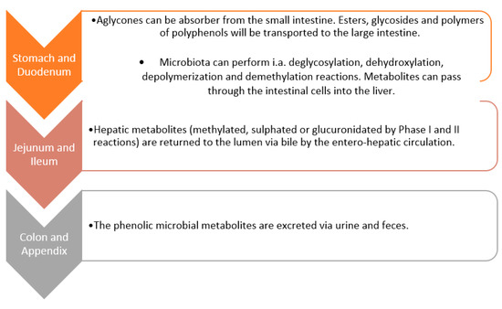 Research suggests that polyphenolic compounds are characterised by low bioavailability. This is due to several factors, such as interaction with the food matrix, the metabolic processes mediated by the liver (phase I and II metabolism), intestine and microbiota. Moreover, the metabolites of compounds produced in vivo may participate in their known biological activity—antioxidant or anti-inflammatory [66].
