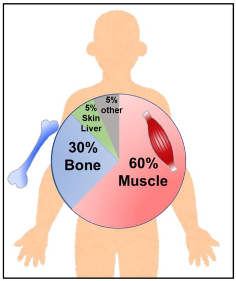 Zinc was first reported as an essential trace element important for maintaining health, based on the discovery of “zinc deficiency” more than half a century ago []. Since then, various studies have been conducted to reveal zinc-related physiological responses, from both basic principles and clinical points of view. In the last decade, intensive research using genetically modified mice and human genetic analysis have led to outstanding progress in understanding the importance of zinc in terms of in vivo functions and its relationship with human diseases, attracting renewed attention. Zinc regulates various physiological responses, including growth, differentiation, maturation, and immune responses. Approximately 60% of the zinc in the body is stored in skeletal muscles, 30% in bones, and 5% in the skin and liver (Figure 1). Approximately 10% of the proteins in the human body exert their functions by binding with zinc and controlling various physiological responses at the molecular level [,,,]. Therefore, proper regulation of zinc levels in vivo is vital for maintaining physiological functions and health. Prolonged zinc deficiency and low zinc status caused by inadequate dietary zinc intake can give rise to a plethora of detrimental health consequences. Low zinc status can lead to various symptoms such as parageusia, skin disorder, and growth retardation, highlighting the importance of zinc homeostasis in maintaining vital activities []. Hence, ensuring adequate zinc intake through diet or supplementation is critical for averting deleterious health consequences associated with low zinc status.