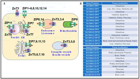 Schematic diagram of zinc transporter distribution in the cell (A) and in the tissues (B). Zinc transporters are expressed in organelles and cell membranes of various tissues. To maintain zinc levels in the cells, ZIP family members increase intracytoplasmic zinc concentration, and ZnT family members decrease intracytoplasmic zinc concentration.
