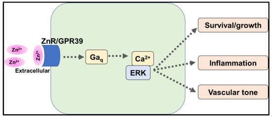 Pathway of intracellular activity by zinc signal via ZnR/GPR39. Zinc signaling via ZnR/GPR39 activates MAPK/ERK via Gαq, which is involved in cell survival and proliferation, angiogenesis, inflammatory responses, and vascular tone.