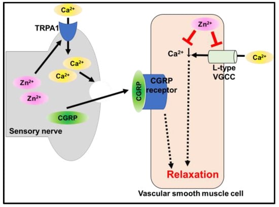 Betrie et al. demonstrated the effect of changing cytoplasmic zinc levels in blood vessels and smooth muscles. An increase in cytoplasmic zinc using a zinc ionophore showed a vasorelaxation effect; however, the chelation of cytoplasmic zinc increased the contraction of blood vessels and smooth muscles (Figure 6). They suggested that the effect of elevated cytoplasmic zinc levels stimulated TRPA1 activation, followed by the modulation of calcitonin gene-related peptide (CGRP) signaling in the sensory nerves, inhibiting voltage-gated calcium channels in vascular smooth muscle cells [].