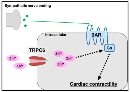 Zinc is involved in cardiac contractility. Schematic of the signaling pathway via TRPC6. Solid arrows represent mass transfer, dashed arrows represent signal transduction, and intracellular zinc influx via TRPC6 enhances β-adrenergic receptor (AR)-mediated Gs signaling, resulting in enhanced myocardial contractility.