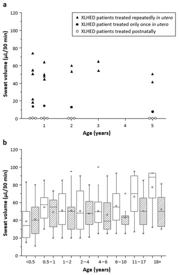 - Schneider, H.; Hammersen, J.; Preisler-Adams, S.; Huttner, K.; Rascher, W.; Bohring, A. Sweating ability and genotype in individuals with X-linked hypohidrotic ectodermal dysplasia. J. Med. Genet. 2011, 48, 426–432. [Google Scholar] [CrossRef]