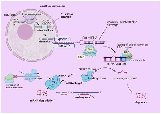 A schematic presentation of miRNA biogenesis. The mechanism of miRNAs biogenesis starts with DNA transcription of specific miRNAs coding genes, under the enzymatic action of RNA polymerase II inside the nucleus. Pri-miRNA arises and is cleaved under the action of DGCR8–Drosha (ribonuclease III), giving rise to pre-miRNA, which is relocated to the cytoplasm via Exportin 5 and Ran-GTP. Pre-miRNA then is cleaved by the Dicer-TRBP, forming the duplex miRNA, which is further loaded on the RISC complex. The active miRNA strand (leading strand/mature miRNA) is loaded on RISC (miRISC) and the other is the so-called passenger, which becomes degraded. The miRISC (seed sequence) binds a target mRNA, which leads to the repression of the mRNA translation, as well as its silencing or degradation. The figure was created with “BioRender.com” (agreement number OS252V998Q).