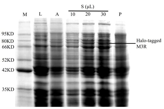 The M3R expression in E. coli lysates was analyzed using sodium dodecyl sulfate–polyacrylamide gel electrophoresis. A sharp band (73.4 kDa) was observed between 66.0 and 80.0 kDa in the autoinduction media sample; however, it was not found in the negative control lysate (Figure 1). Based on the theoretical calculations of M3R (40.4 kDa) and the Halo-tag (33.0 kDa), we considered that this band was the expressed Halo-tagged M3R. in addition to the increase of loaded sample from 10 μL to 30 μL, the band gradually became stronger. Such bands appeared mainly in the supernatant rather than the precipitate, implying that the expressed receptor is soluble because it mainly appeared in the aqueous supernatant but not in the sedimentary fraction.