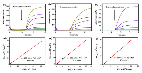Analysis of the association constants of atropine sulfate, pilocarpine, and (−)-scopolamine hydrochloride with M3R by frontal affinity chromatography. The breakthrough curves of atropine sulfate (a), pilocarpine (b), and (−)-scopolamine hydrochloride (c) by the M3R-immobilized column. The regression curves of atropine sulfate (d), pilocarpine (e), and (−)-scopolamine hydrochloride (f) obtained by plotting 1/mLapp vs. 1/[A].