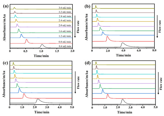 Peak profile analysis is a powerful method for determining the dynamics of drug–protein interactions. A previous study revealed that the concentration of the injected solute plays a crucial role in the apparent dissociation rate constant (kd) examined by peak profile analysis. The kd value can be accurately detected once the flow rate is high enough to keep the term κ (kinetic factor) constant [21]. Therefore, an optimal flow rate is required to ensure the accurate measurement of kinetic parameters by a peak profile analysis. In this experiment, we chose flow rates of 0.4, 0.8, 1.2, 1.6, 2.0, 2.4, 2.8, 3.2, and 3.6 mL/min.