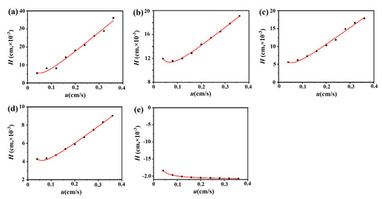 Fitting plots of the three M3R-bound drugs, sodium nitrate, and the theoretical non-retained substance. Fitting curves of the M3R-bound linear velocity (u) vs. plate height (H) of sodium nitrate (a), atropine sulfate (b), pilocarpine (c), (−)-scopolamine hydrochloride (d), and the theoretical non-retained substance (e).