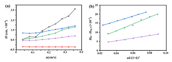 where HR and HM represent the solution’s total plate height as well as the non-retained substance on the column, respectively, u refers to the linear velocity of the mobile phase, and k indicates the analytic retention factor. The kd value can be estimated through plotting the curve of (HR−HM) vs. (uk)/(1 + k)2, which leads to an inverse linear relationship of the slope and kd.